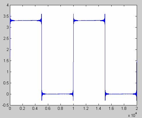 因此如果疊加足夠多的諧波,我們就可以近似的合成出方波。圖2是疊加到217次諧波后的波形。已經非常近似方波了,不用關心角上的那些毛刺,那是著名的吉博斯現象,這種仿真必然會有的,但不影響對問題的理解。這里我們疊加諧波的最高頻率達到了21.7GHz。