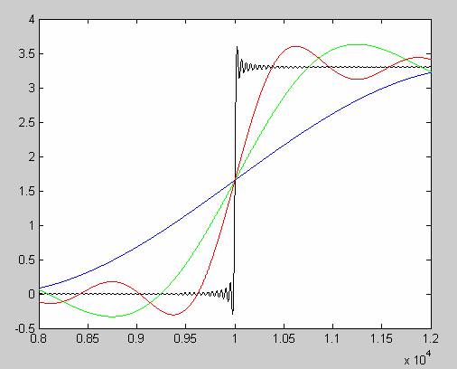 現在我們看看疊加不同頻譜成分對上升沿的影響。圖3是對比顯示。藍色是基頻信號上升邊,綠色是疊加了3次諧波后的波形上升邊沿,紅色是基頻+3次諧波+5次諧波+7次諧波后的上升邊沿,黑色的是一直疊加到217次諧波后的波形上升邊沿。