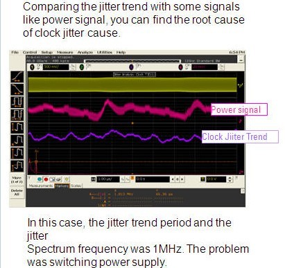對(duì)于系統(tǒng),出現(xiàn)時(shí)鐘問題時(shí),很多時(shí)候與供電電源有關(guān)(約占80%以上),這時(shí)候可以使用抖動(dòng)分析軟件抖動(dòng)趨勢(shì)圖方法進(jìn)行問題根源跟蹤:因?yàn)槎秳?dòng)趨勢(shì)圖和其他通道信號(hào)可以同時(shí)顯示在示波器的屏幕上,當(dāng)發(fā)現(xiàn)抖動(dòng)趨勢(shì)圖和電源信號(hào)同步變化時(shí),基本可以確定抖動(dòng)問題是來自這個(gè)電源。