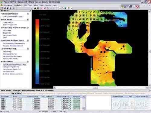 布線工程師、系統(tǒng)工程師、信號完整性工程師和電源設(shè)計工程師還可以將IR壓降分析結(jié)合在約束管理器(constraint manager)中,作為對PCB上每一個電源和地網(wǎng)表進行設(shè)計規(guī)則核查的最終檢驗工具(DRC)。這種通過自動化軟件分析的設(shè)計流程可以避免靠目測,甚至經(jīng)驗所不能發(fā)現(xiàn)的復(fù)雜電源供電系統(tǒng)結(jié)構(gòu)上的布局布線問題。圖2展示了IR壓降分析可以準(zhǔn)確地指出一高性能PCB上電源供電系統(tǒng)中關(guān)鍵電壓電流的分布。