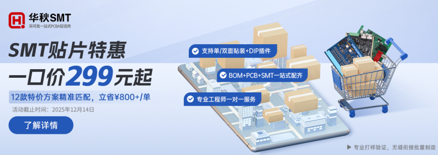 活動規(guī)則:1)本活動新老客戶均可參與、不限參與次數(shù)、僅限SMT+IC+PCB訂單可參與;2)本活動特價(jià)費(fèi)用僅指SMT費(fèi)用,不包含BOM物料費(fèi)和PCB打板費(fèi);3)本活動不支持鋼網(wǎng)隨貨發(fā)、程序燒錄、物料烘烤、功能測試、組裝、三防漆等特殊工藝要求;4)本活動訂單中的PCB不支持圓形及其他異形板、PCB的厚度≥1.0mm、至少有兩邊工藝邊且寬度5.0mm、必須含有MARK點(diǎn)且距板邊≥3.0mm;5)本活動不支持含有0201以下封裝的物料,BGA焊盤中心間距必須≥0.5mm;6)本活動一個(gè)貼片訂單僅限一個(gè)貼片BOM;7)本活動不可與其他任何折扣活動和優(yōu)惠券同享。溫馨提示:1)本活動暫不支持部分特殊類型訂單和部分特殊工藝,最終以訂單審核結(jié)果為準(zhǔn);2)本活動最終解釋權(quán)歸華秋電子所有。